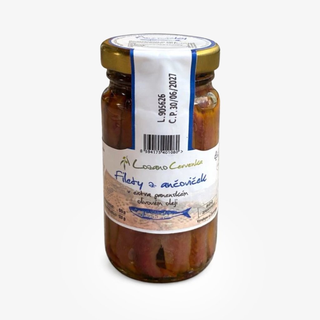 | Složení: | Filety z Ančoviček (Engraulis encrasicolus), Extra panenský olivový olej Picual, sůl |